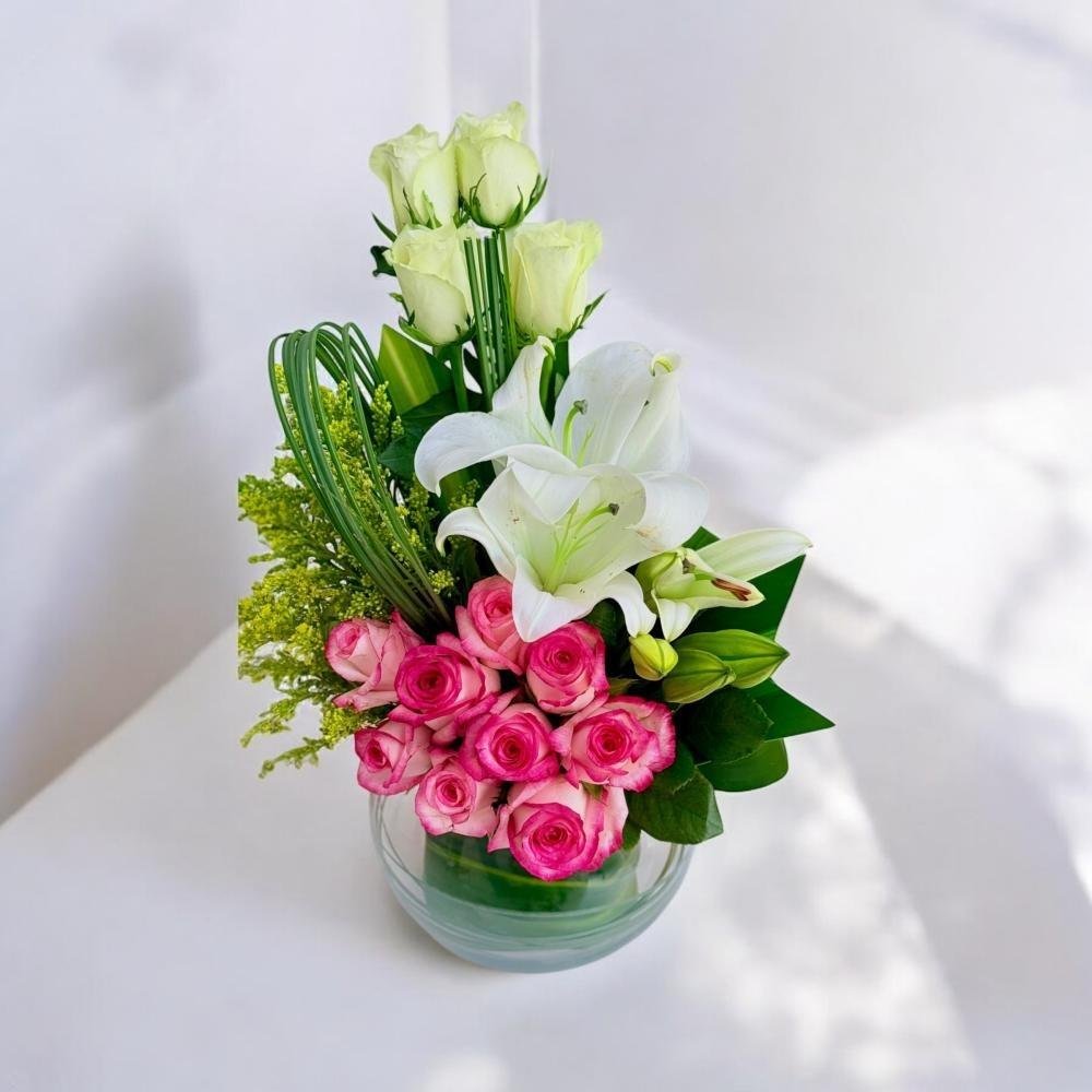 باقة ساحرة تمزج بين أناقة الورود الوردية والبيضاء وجمال زهور الكازابلانكا النقية، منسقة بعناية في فازة زجاجية دائرية شفافة.